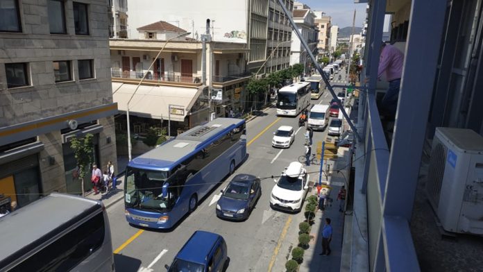 Πορεία στο κέντρο του Βόλου με τα τουριστικά λεωφορεία
