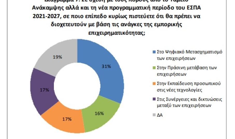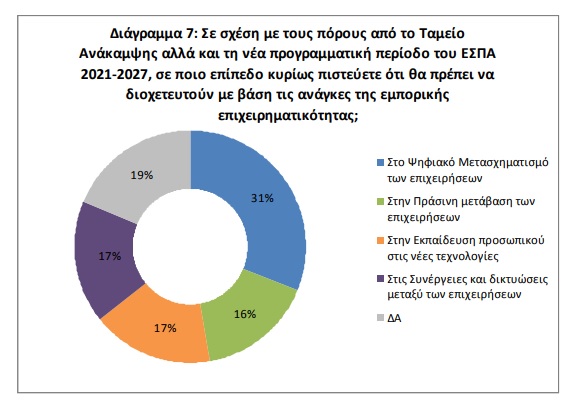 Η πρόκληση του ψηφιακού μετασχηματισμού – η ελπίδα: Α. Ιδιαίτερο ενδιαφέρον παρουσιάζει η άποψη των επιχειρήσεων σε σχέση με την αξιοποίηση των πόρων από το Ταμείο Ανάκαμψης αλλά και τη νέα προγραμματική περίοδο ΕΣΠΑ 2021-2027. Φαίνεται ότι ο ψηφιακός μετασχηματισμός της επιχείρησης αποτελεί κυριότερη ανάγκη της εμπορικής επιχειρηματικότητας καθώς οι περισσότερες από τις επιχειρήσεις (31%) θεωρούν ότι οι ευρωπαϊκοί πόροι θα πρέπει να κατευθυνθούν προς την επιτάχυνση του ψηφιακού μετασχηματισμού των επιχειρήσεων. Ένα σημαντικό τμήμα των επιχειρήσεων (17%) θεωρεί πως τα κονδύλια θα πρέπει να υποβοηθήσουν τις συνέργειες και τις δικτυώσεις των επιχειρήσεων, την εκπαίδευση του προσωπικού στις νέες τεχνολογίες (17%) αλλά και τον πράσινο μετασχηματισμό των επιχειρήσεων (16%).