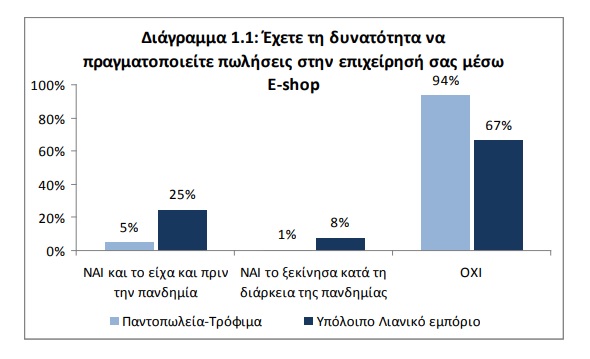 Γ. Τέλος, από τις επιχειρήσεις που διαθέτουν ηλεκτρονικό κατάστημα (eshop) οι μισές θεωρούν την υποστήριξη του ψηφιακού μετασχηματισμού της επιχείρησης ως τη κρισιμότερη ανάγκη της. Τo στοιχείο αυτό υπόκειται δυνητικά σε μια διττή ανάγνωση, πρώτον η ψηφιοποίηση δεν εξαντλείται σε ένα ηλεκτρονικό κατάστημα, το οποίο είναι μια βασική ψηφιακή υποδομή, και δεύτερον εντός του κλάδου του εμπορίου υπάρχουν οι κρυφοί επιταχυντές (hidden drivers) της ψηφιακής μετάβασης, οι οποίοι και θα πρέπει να υποστηριχθούν από τις δημόσιες πολιτικές.