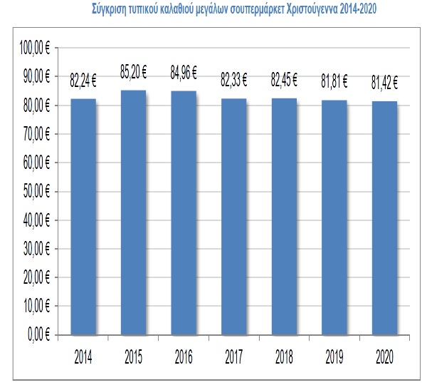 1. Οι τιμές των προϊόντων του τυπικού Χριστουγεννιάτικου τραπεζιού στα μεγάλα σουπερμάρκετ το 2020 είναι αμετάβλητες κατά μέσο όρο σε σχέση με το 2019, ενώ βρίσκονται στα ίδια επίπεδα με το 2014.