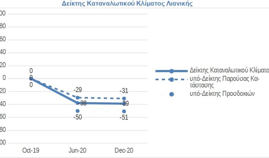 Καταρχάς, ο δείκτης καταναλωτικού κλίματος λιανικής, τον Δεκέμβριο του 2020 διαμορφώθηκε στο -39, σαφώς μειωμένος σε σχέση με τον μήνα βάσης, τον Οκτώβριο του 2019 και ελαφρώς μειωμένος σχέση με τη μέτρηση του Ιουνίου 2020. Όπως φαίνεται, η συγκεκριμένη εξέλιξη δεν έχει να κάνει τόσο με τις μέχρι σήμερα οικονομικές εξελίξεις, αλλά κυρίως λόγω των μειωμένων προσδοκιών των καταναλωτών για το προσεχές διάστημα. Συγκεκριμένη η μείωση στον υπο-Δείκτη παρούσας κατάστασης ήταν περιορισμένη στο -31, ενώ αντίθετα ο υπό-δείκτης προσδοκιών παρουσίασε μεγάλη πτώση και έπεσε στο -51.