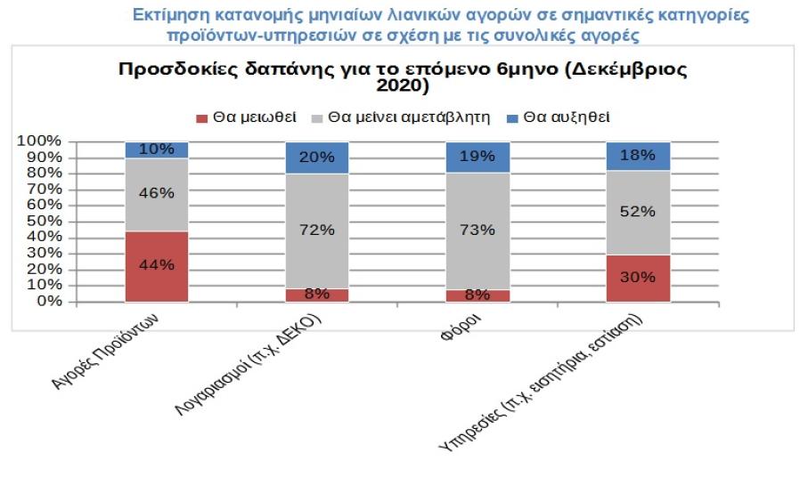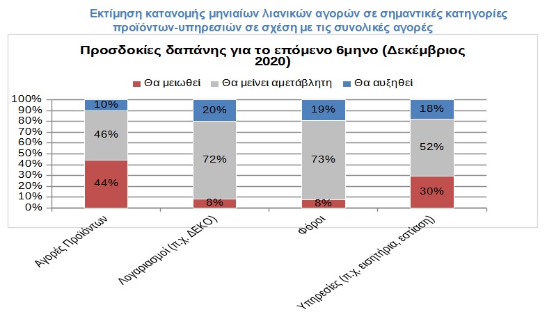 Οι προσδοκίες για τις δαπάνες είναι επίσης αρνητικές. Όπως καταγράφεται στο σχήμα 5, το 44% εκτιμά ότι οι δαπάνες για αγορές προϊόντων το πρώτο εξάμηνο 2021 θα είναι μειωμένες, ενώ μόλις το 10% ότι θα είναι αυξημένες. Το ίδιο ισχύει για τις υπηρεσίες (εισιτήρια, εστίαση) για τα οποία επίσης εκτιμάται από το 30% του κοινού μείωση – παρότι είναι ήδη κλειστοί οι κλάδοι αυτοί – και μόλις 18% αύξηση. Αυξητική τάση καταγράφεται όμως για τις πάγιες δαπάνες όπως λογαριασμοί (20% αύξηση έναντι 8% μείωση) και φορολογία (19% αύξηση έναντι 8% μείωση).