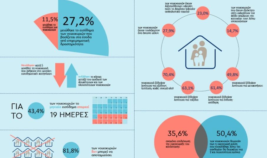 • Ανησυχητική είναι η οικονομική βιωσιμότητα για περισσότερα από 4 στα 10 νοικοκυριά καθώς το μηνιαίο εισόδημα τους εξαντλείται πριν το τέλος του μήνα. Μεσοσταθμικά για αυτά τα νοικοκυριά επαρκεί για 19 ημέρες. Τα πολυμελή νοικοκυριά, εκείνα με τουλάχιστον ένα άνεργο μέλος και τα νοικοκυριά με τα χαμηλότερα εισοδήματα φαίνεται πως αντιμετωπίζουν τις μεγαλύτερες δυσκολίες και βρίσκονται αντιμέτωπα με το φάσμα της φτώχειας.