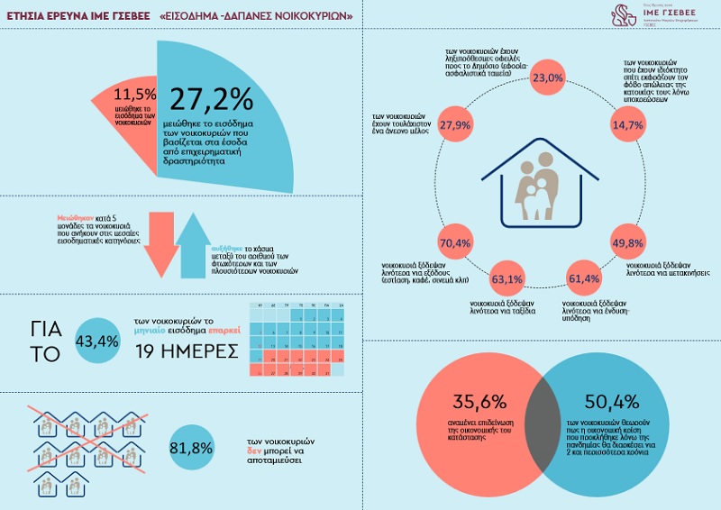 Η ετήσια έρευνα του ΙΜΕ ΓΣΕΒΕΕ για το εισόδημα και τις δαπάνες διαβίωσης των νοικοκυριών διεξήχθη στις πρωτόγνωρες συνθήκες που έχει δημιουργήσει η εκδήλωση της πανδημικής κρίσης του Covid-19. Η υγειονομική κρίση που στην οικονομία εκδηλώθηκε με την μορφή της βαθιάς και απότομης ύφεσης, όπως είναι επόμενο, έχει επηρεάσει αρνητικά τους δείκτες που αναδεικνύουν την κατάσταση των ελληνικών νοικοκυριών. Μολονότι η συνολική εικόνα που σχηματίζεται από αυτούς τους δείκτες δεν ισοδυναμεί με εκείνη μιας ολοκληρωτικής καθήλωσης, εντούτοις μια προσεκτική ανάγνωση αυτών των δεικτών φέρνει στην επιφάνεια μια σειρά χαρακτηριστικών που διαφοροποιούν την εικόνα σε σύγκριση με προηγούμενες έρευνες ενώ, την ίδια στιγμή, δείχνουν τις δυσοίωνες προοπτικές που επιφυλάσσει η επίπτωση της υγειονομικής κρίσης για την ελληνική οικονομία και συγκεκριμένα για τα νοικοκυριά.