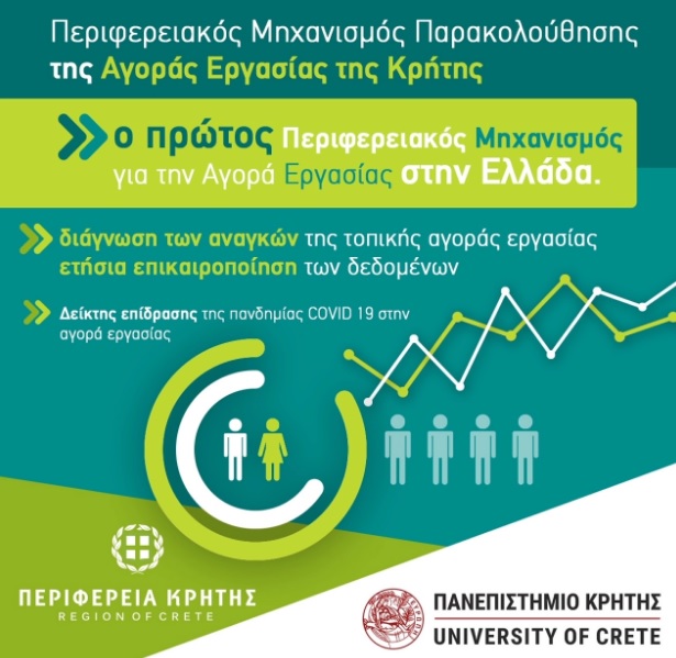 Η Περιφέρεια Κρήτης πρώτη σε επίπεδο χώρας διαθέτει στοιχεία για τις επιπτώσεις της πανδημίας COVID-19 στην τοπική αγορά εργασίας, μέσα από τον Περιφερειακό Μηχανισμό Παρακολούθησης της Αγοράς Εργασίας που υλοποιεί σε συνεργασία με τη Μονάδα Ερευνών Αγοράς και Επιχειρηματικότητας του Πανεπιστημίου Κρήτης.