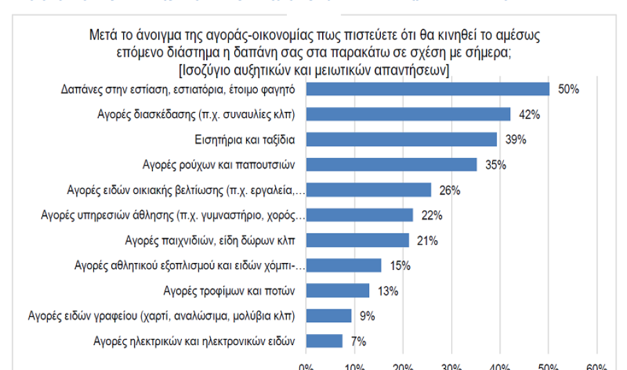 Παρότι η πρόθεση για επίσκεψη της αγοράς της εστίασης το επόμενο δίμηνο έχει μικρότερη πληθυσμιακή διείσδυση (σχήμα 2) συγκριτικά με την διείσδυση του λιανεμπορίου, είναι αυτή που παρουσιάζει την μεγαλύτερη πρόθεση ποσοστιαίας αύξησης της δαπάνης (σχήμα 3). Η αιτία είναι ότι συγκριτικά ξεκινάει με πολύ χαμηλότερη βάση η δαπάνη, ενώ αντίθετα η δαπάνη του λιανεμπορίου διατηρείται σε ένα βαθμό λόγω του ηλεκτρονικού εμπορίου. Παρόλα αυτά, ενδεικτικό της διάθεσης του κοινού για αγορές είναι ότι όλες ανεξαιρέτως οι κατηγορίες που εξετάζονται στο σχήμα 3 παρουσιάζουν αυξητική τάση. Συγκεκριμένα: