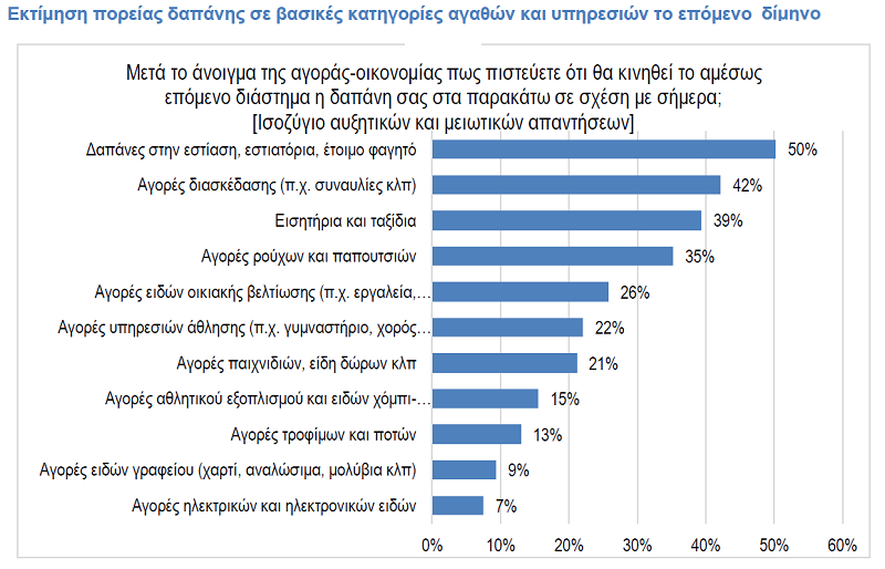 • Τη μεγαλύτερη προσδοκώμενη αύξηση της δαπάνης παρουσιάζουν οι δαπάνες που έχουν να κάνουν με την διασκέδαση. Η εστίαση κατά 50%, οι αγορές διασκέδασης (π.χ. συναυλίες) κατά 42% και τα ταξίδια κατά 39%.