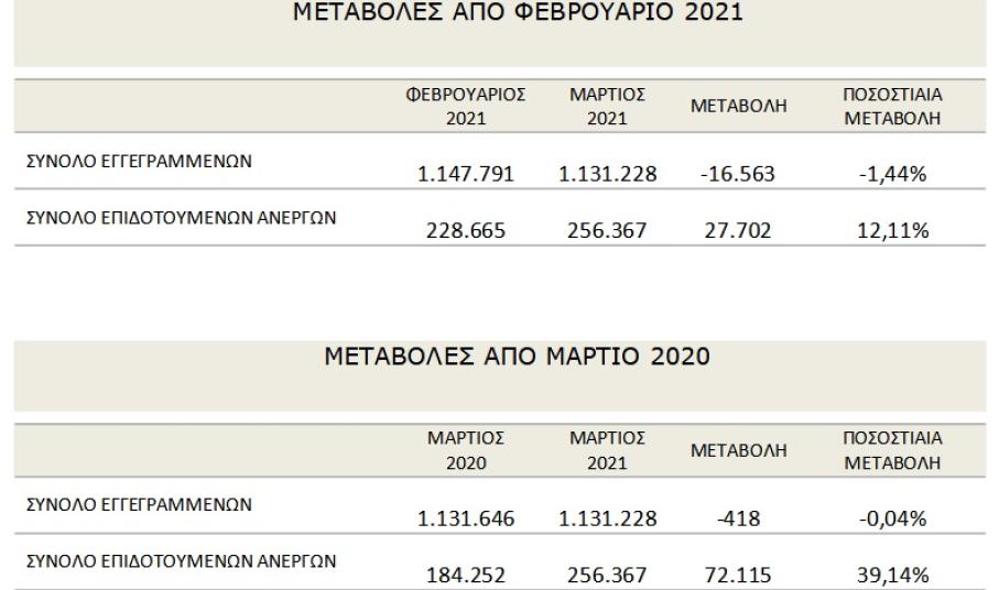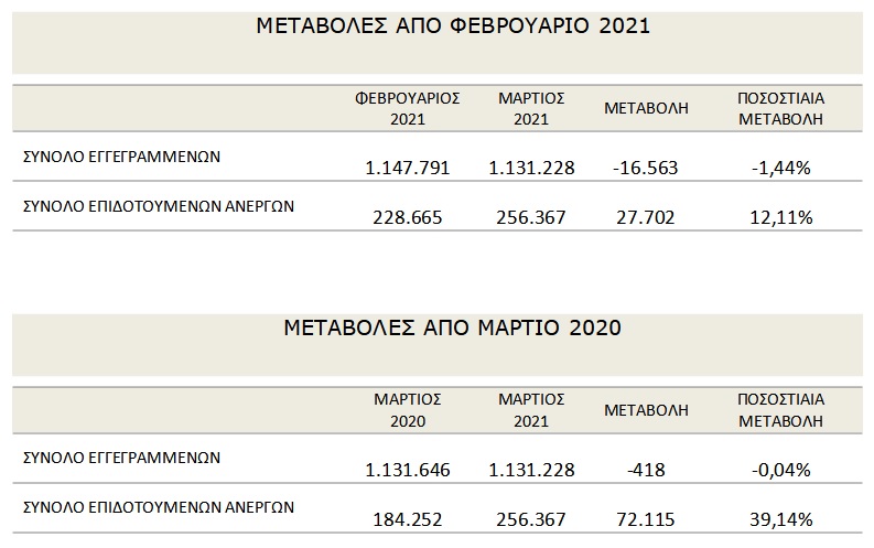 Στατιστικά στοιχεία εγγεγραμμένης ανεργίας ΟΑΕΔ Μάρτιος 2021
