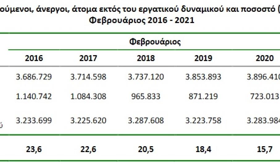Τα άτομα που δεν περιλαμβάνονται στο εργατικό δυναμικό, ή «άτομα εκτός του εργατικού δυναμικού», δηλαδή τα άτομα που δεν εργάζονται ούτε αναζητούν εργασία, ανήλθαν σε 3.465.570, σημειώνοντας αύξηση κατά 181.586 άτομα σε σχέση με τον Φεβρουάριο του 2020 (+ 5,5%) και κατά 8.637 άτομα σε σχέση με τον Ιανουάριο του 2021 (+ 0,2%).