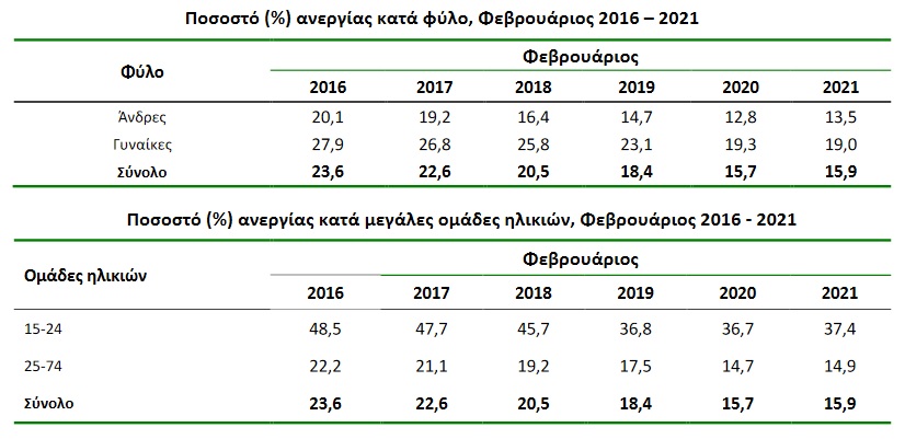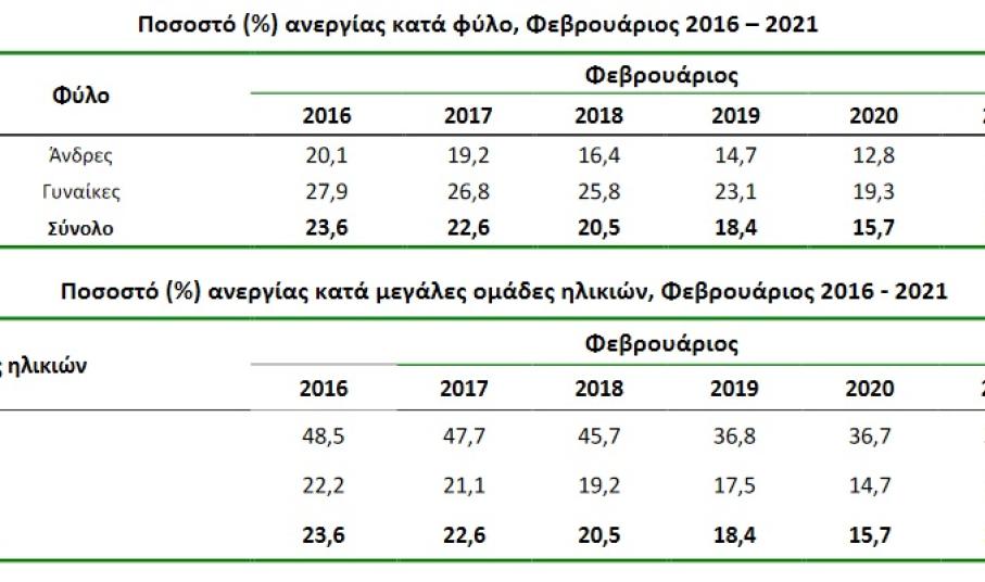 Το εποχικά διορθωμένο ποσοστό ανεργίας τον Φεβρουάριο του 2021 ανήλθε σε 15,9% έναντι 15,7% τον Φεβρουάριο του 2020 και του διορθωμένου προς τα άνω 16,1% τον Ιανουάριο του 2021. Οι απασχολούμενοι ανήλθαν σε 3.707.704 άτομα σημειώνοντας μείωση κατά 188.706 άτομα σε σχέση με τον Φεβρουάριο του 2020 (-4,8%) και αύξηση κατά 61 άτομα σε σχέση με τον Ιανουάριο του 2021 (μη σημαντική μεταβολή).