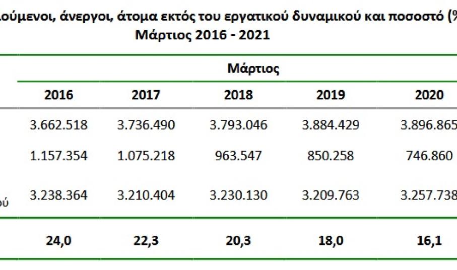 • Τα άτομα που δεν περιλαμβάνονται στο εργατικό δυναμικό ή «άτομα εκτός του εργατικού δυναμικού», δηλαδή τα άτομα που δεν εργάζονται ούτε αναζητούν εργασία, ανήλθαν σε 3.477.133, σημειώνοντας αύξηση κατά 219.395 άτομα σε σχέση με τον Μάρτιο του 2020 (+6,7%) και κατά 29.325 άτομα σε σχέση με τον Φεβρουάριο του 2021 (+0,9%).