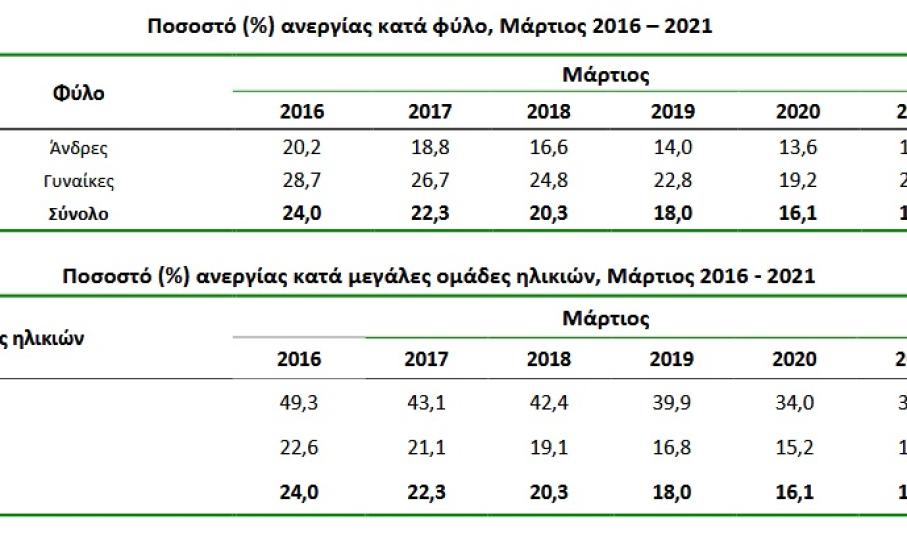 • Το εποχικά διορθωμένο ποσοστό ανεργίας τον Μάρτιο του 2021 ανήλθε σε 16,3% έναντι του διορθωμένου προς τα άνω 16,1% τον Μάρτιο του 2020 και του διορθωμένου προς τα άνω 16,6% τον Φεβρουάριο του 2021.