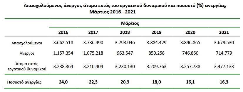 • Οι άνεργοι ανήλθαν σε 714.779 άτομα σημειώνοντας μείωση κατά 32.081 άτομα σε σχέση με τον Μάρτιο του 2020 (-4,3%) και κατά 18.384 άτομα σε σχέση με τον Φεβρουάριο του 2021 (-2,5%).