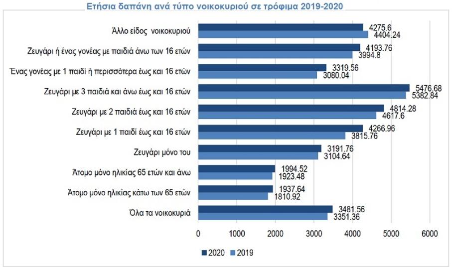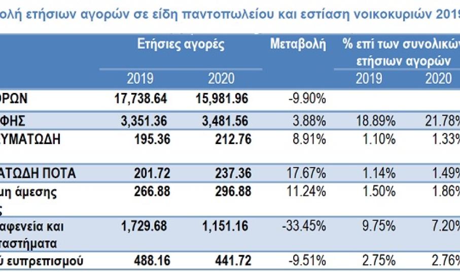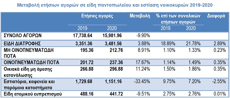 Καταρχάς καταγράφεται μία αύξηση στη δαπάνη τροφίμων το 2020 σε σχέση με το 2019. Συγκεκριμένα κατά 3,88% από 3.351,36 ευρώ ανά νοικοκυριό σε 3.481,56 ευρώ ανά νοικοκυριό. Η αύξηση ήταν ακόμα μεγαλύτερη για τα οινοπνευματώδη ποτά κατά 17,67% όπως και για τα οικιακά είδη άμεσης κατανάλωσης (π.χ. απορρυπαντικά, χαρτικά κλπ) κατά 11,24%. Αντίθετα μείωση παρουσίασαν τα είδη ατομικού ευπρεπισμού (π.χ. είδη προσωπικής φροντίδας) κατά -9,51% και ειδικά η εστίαση κατά -33,45%. Συνολικά, οι δαπάνες για διατροφή (αθροιστικά αγορές τροφίμων και εστίασης) παρουσίασαν το 2020 μείωση κατά -7.22%, από 5.478,12 ευρώ σε 5.082,84 ευρώ.