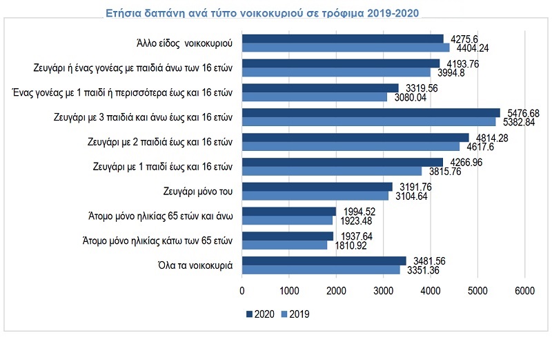 Παράλληλα, καταγράφονται σημαντικές διαφοροποιήσεις στην αύξηση της ετήσια δαπάνης τροφίμων ανάμεσα στους διαφορετικούς τύπου νοικοκυριών. Μεγαλύτερες αυξήσεις καταγράφονται κυρίως στα νοικοκυριά με 1 παιδί έως 16 ετών, στα ζευγάρια με 1 παιδί κατά 11,82% και στις μονογονεϊκές οικογένειες με 1 παιδί κατά 7,78%, καθώς και στα νοικοκυριά με 1 άτομο έως 65 ετών κατά 7%.