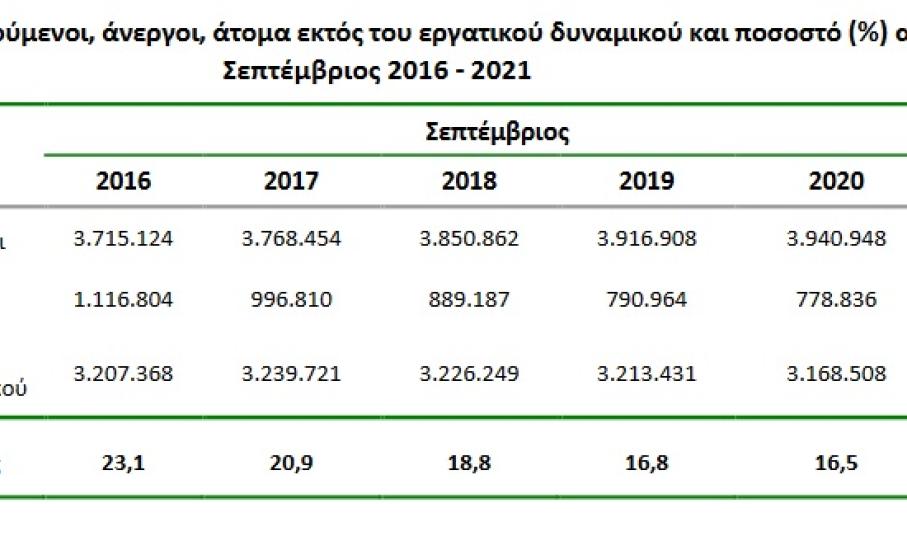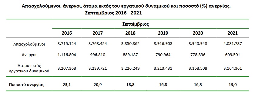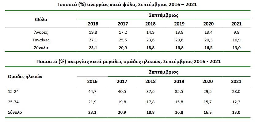 • Το εποχικά διορθωμένο ποσοστό ανεργίας τον Σεπτέμβριο του 2021 ανήλθε σε 13,0% έναντι 16,5% τον Σεπτέμβριο του 2020 και 13,9% τον Αύγουστο του 2021.