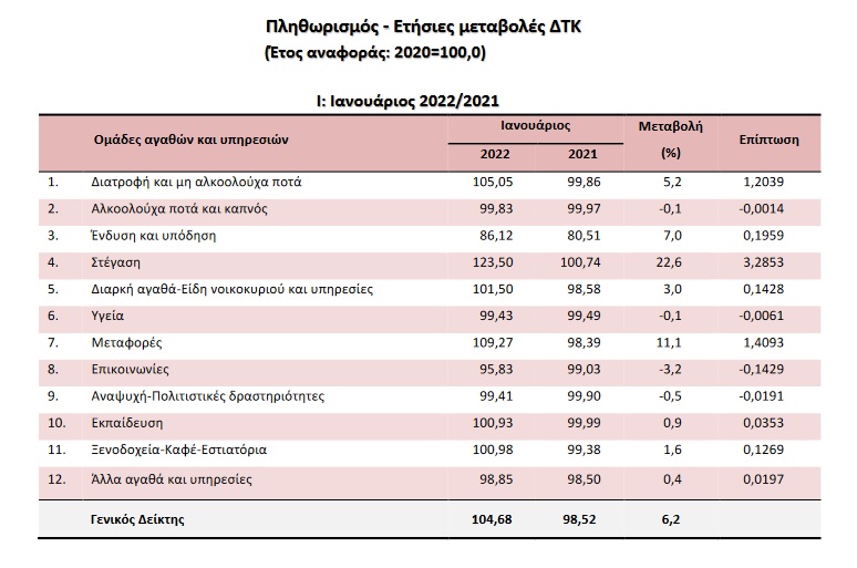 Η αύξηση του Γενικού ΔΤΚ κατά 6,2% τον μήνα Ιανουάριο 2022, σε σύγκριση με τον αντίστοιχο Δείκτη του Ιανουαρίου 2021, προήλθε κυρίως από τις μεταβολές στις ακόλουθες ομάδες αγαθών και υπηρεσιών: