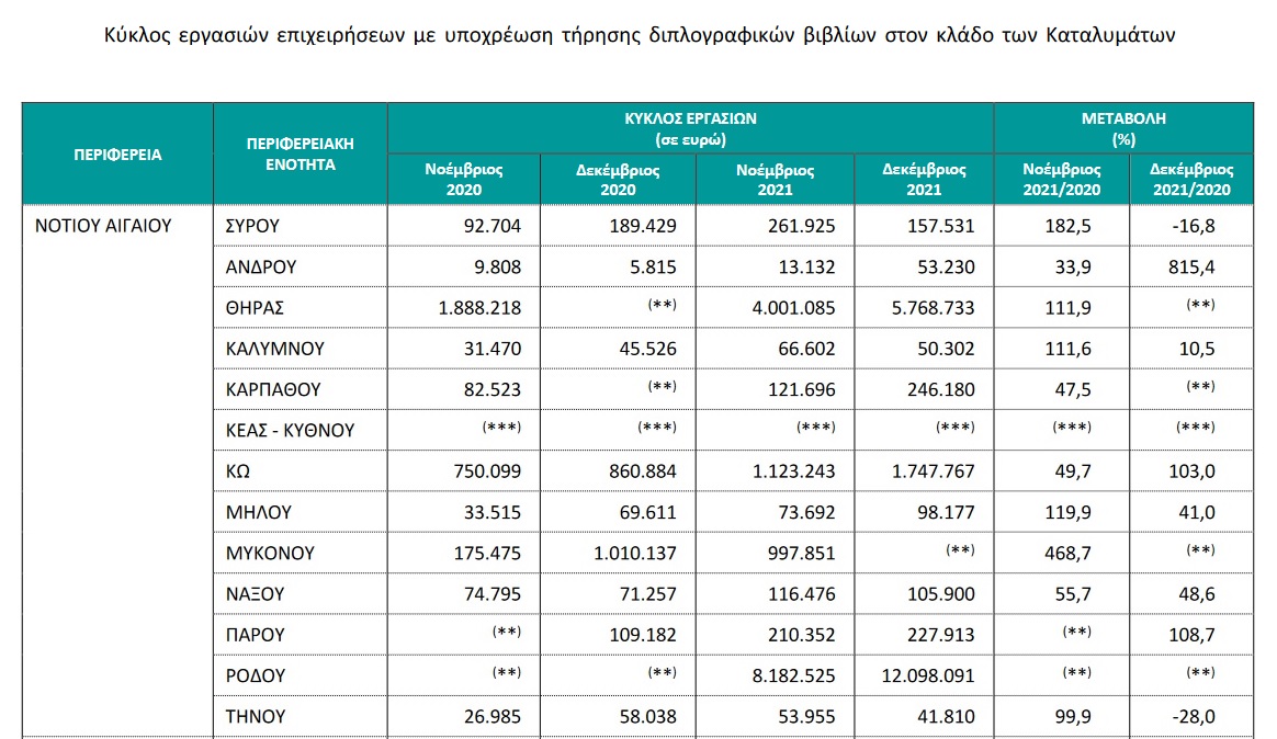 Στο σύνολο των επιχειρήσεων του κλάδου παροχής καταλυμάτων, ο κύκλος εργασιών το έτος 2021 ανήλθε σε 5.176.144.589 ευρώ, σημειώνοντας αύξηση 118,3% σε σχέση με το έτος 2020, όπου είχε ανέλθει σε 2.371.365.548 ευρώ. Για τις επιχειρήσεις των Περιφερειακών Ενοτήτων με συνεισφορά στον συνολικό κύκλο εργασιών έτους 2020 μεγαλύτερη από 1,0%, η μεγαλύτερη αύξηση στον κύκλο εργασιών μεταξύ των ετών 2021 και 2020 παρατηρήθηκε στην Περιφερειακή Ενότητα Μυκόνου (277,4%) και η μικρότερη αύξηση (64,6%) καταγράφηκε στην Περιφέρεια Αττικής.