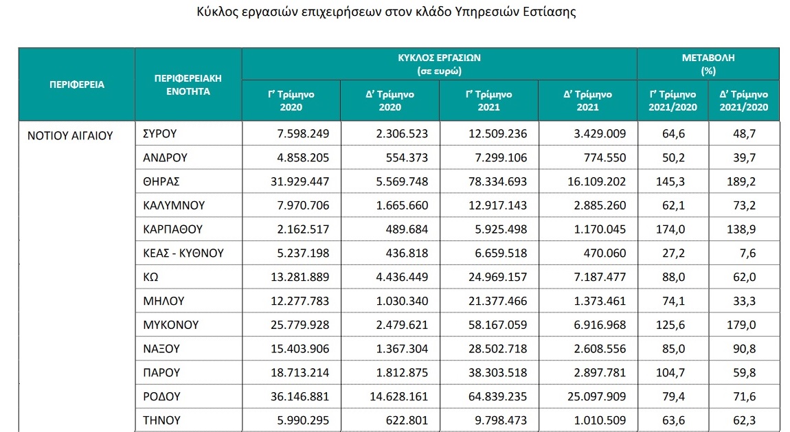 Στο σύνολο των επιχειρήσεων του κλάδου υπηρεσιών εστίασης, ο κύκλος εργασιών το τέταρτο τρίμηνο 2021 ανήλθε σε 1.320.623.995 ευρώ, σημειώνοντας αύξηση 70,0% σε σχέση με το τέταρτο τρίμηνο 2020, όπου είχε ανέλθει σε 776.795.990 ευρώ. Για τις επιχειρήσεις των Περιφερειακών Ενοτήτων με συνεισφορά στον συνολικό κύκλο εργασιών έτους 2020 μεγαλύτερη από 1,0%, η μεγαλύτερη αύξηση στον κύκλο εργασιών το τέταρτο τρίμηνο 2021 σε σύγκριση με το τέταρτο τρίμηνο 2020 παρατηρήθηκε στην Περιφερειακή Ενότητα Θήρας (189,2%) και η μικρότερη αύξηση (27,5%) καταγράφηκε στην Περιφερειακή Ενότητα Κορινθίας.