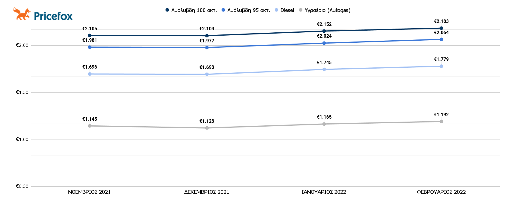Συνεχίζεται το Ράλι τιμών με τις στην απλή αμόλυβδη να φτάνει από 1,981€/λίτρο στο 2,064€/λίτρο ενώ παράλληλα η ενισχυμένη βενζίνη έφτασε τα 2,183€/λίτρο μέσα στον Φεβρουάριο. Η μέση τιμή για τους οδηγούς πετρελαιοκίνητων αγγίζει το 1,779€/λίτρο από 1,696€/λίτρο που ήταν το Νοέμβριο. Η μεγαλύτερη έκπληξη είναι οι τιμές του υγραερίου που φτάνουν το 1,192€/λίτρο ενώ τέσσερις μήνες πριν η μέση τιμή ήταν στο 1,145€/λίτρο.