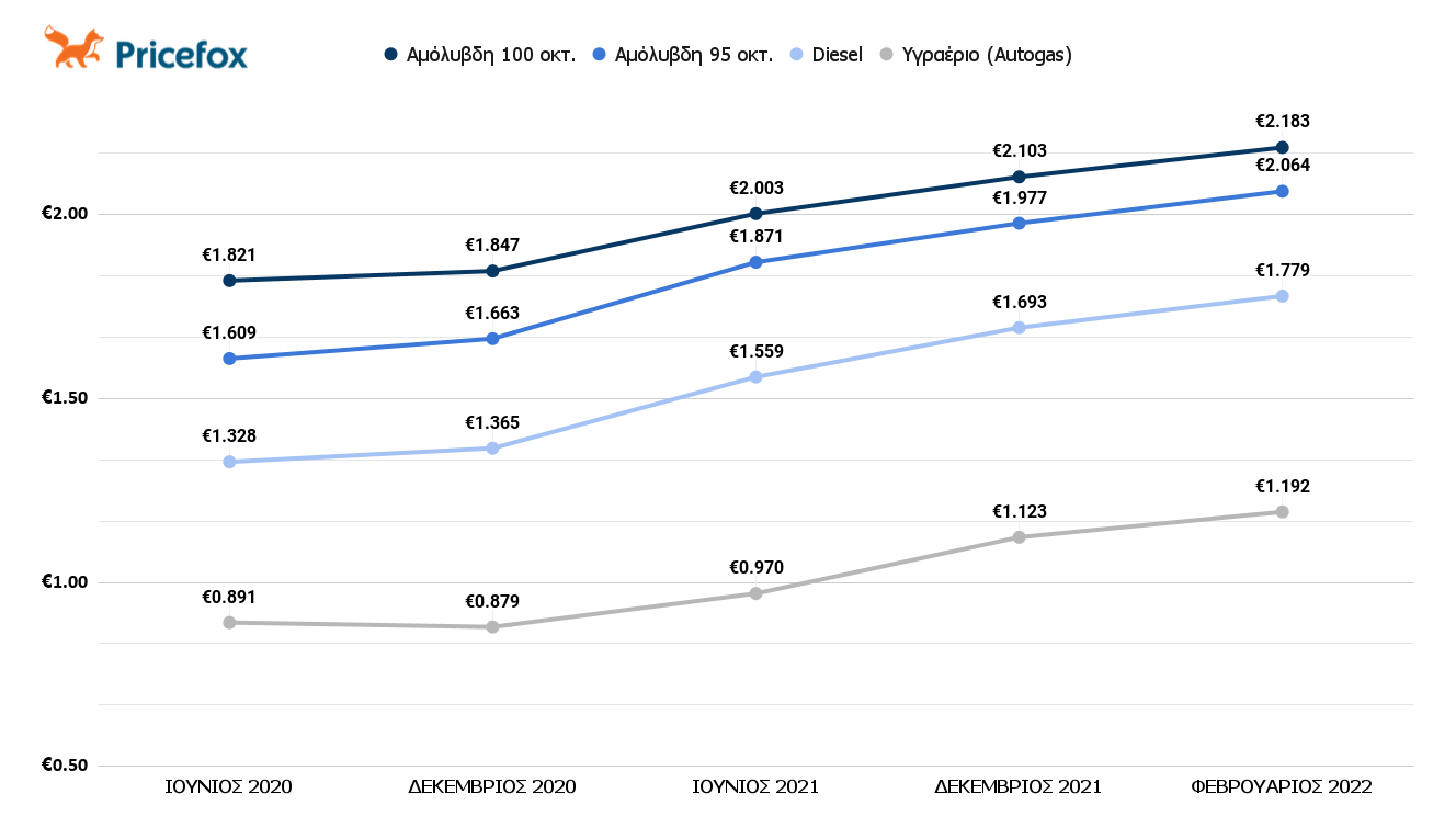 Σύμφωνα με τα στοιχεία του Υπουργείου ανάπτυξης και Ανταγωνιστικότητας, φαίνεται πως το 2020 οι τιμές της απλής βενζίνης άγγιζαν το 1,663€/λίτρο. Μέσα στο πρώτο εξάμηνο του 2021 οι τιμές έφτασαν στο 1,871€/λίτρο, ενώ η χρονιά έκλεισε με τους οδηγούς να πληρώνουν για απλή αμόλυβδη 1,977€/λίτρο. Η έκρηξη τιμών ήρθε τον Φεβρουάριο του 2022 με τους οδηγούς να έρχονται αντιμέτωποι στα πρατήρια καυσίμων με τιμές που εκτοξεύτηκαν στο 1,779€/λίτρο.