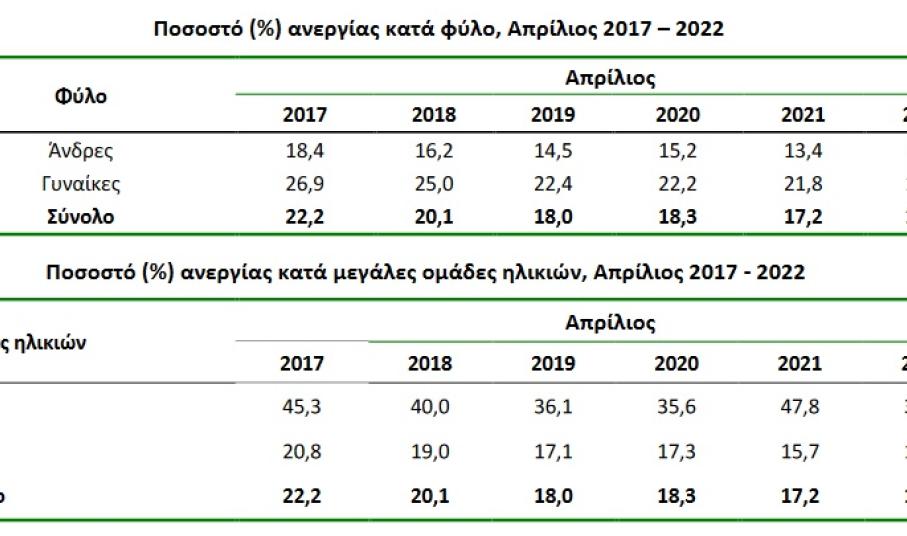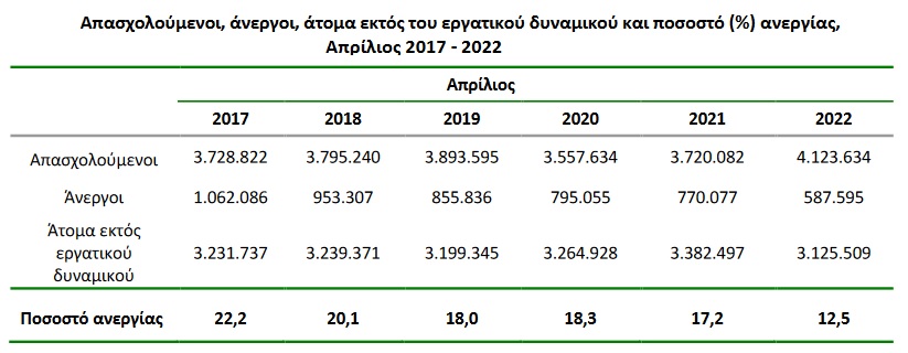 Το εποχικά διορθωμένο ποσοστό ανεργίας τον Απρίλιο του 2022 ανήλθε σε 12,5% έναντι 17,2% τον Απρίλιο του 2021 και του αναθεωρημένου προς τα άνω 12,6% τον Μάρτιο του 2022.