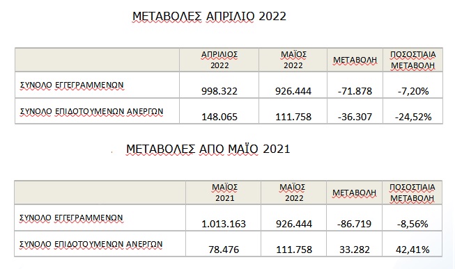 Το σύνολο των εγγεγραμμένων ανέργων, με κριτήριο την αναζήτηση εργασίας (αναζητούντων εργασία), για τον μήνα Μάιο 2022, ανήλθε σε 919.236 άτομα. Από αυτά 532.600 (ποσοστό 57,94%) είναι εγγεγραμμένα στο μητρώο της Δ.ΥΠ.Α για χρονικό διάστημα ίσο ή και περισσότερο των 12 μηνών και 386.636 (ποσοστό 42,06%) είναι εγγεγραμμένα στο μητρώο της Δ.ΥΠ.Α. για χρονικό διάστημα μικρότερο των 12 μηνών. Οι άνδρες ανέρχονται σε 318.977 (ποσοστό 34,70%) και οι γυναίκες ανέρχονται σε 600.259 (ποσοστό 65,30%).