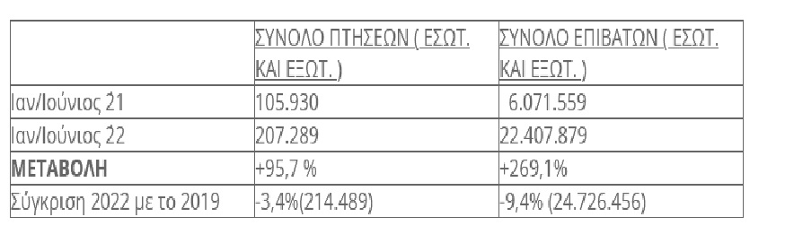 Ο συνολικός αριθμός των διακινηθέντων επιβατών ανήλθε στους 8.398.777, σημειώνοντας άνοδο (+)167,6% σε σχέση με το αντίστοιχο διάστημα του 2021 όπου είχαν διακινηθεί 3.138.908 επιβάτες. Οι πτήσεις σε όλα τα αεροδρόμια της χώρας ανήλθαν στις 67.428, από τις οποίες 22.212 ήταν εσωτερικού και 45.216 εξωτερικού, καταγράφοντας άνοδο (+) 64%, σε σχέση με το αντίστοιχο διάστημα Ιουνίου του 2021 όπου είχαν πραγματοποιηθεί 41.107 πτήσεις. Ειδικότερα, για τις αφίξεις επιβατών πτήσεων εξωτερικού Ιουνίου του 2022 είχαμε άνοδο (+)190,5% που αναλογεί σε 3.480.812 επιβάτες, σε σχέση με τον αντίστοιχο μήνα του 2021 που οι αφίξεις εξωτερικού ήταν 1.198.398 επιβάτες.