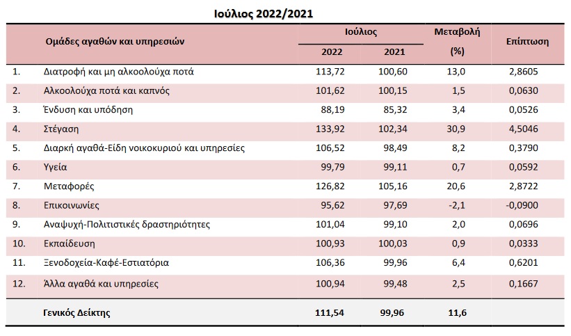 Η αύξηση του Γενικού ΔΤΚ κατά 11,6% τον μήνα Ιούλιο 2022, σε σύγκριση με τον αντίστοιχο Δείκτη του Ιουλίου 2021, προήλθε κυρίως από τις μεταβολές στις ακόλουθες ομάδες αγαθών και υπηρεσιών: