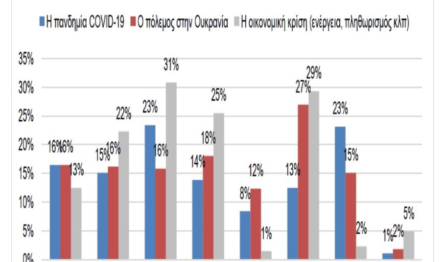 Τα πιο έντονα συναισθήματα πλέον προκαλούνται από την οικονομική κρίση στα νοικοκυριά λόγω της ενεργειακής κρίσης και των ανατιμήσεων. Το 31% δηλώνει ότι νιώθει άγχος, το 29% θυμό, το 25% φόβο και το 23% ανασφάλεια, ενώ ένα ποσοστό 5% δηλώνει ακόμα και πανικό. Μόλις 2% δηλώνει αδιάφορο. Τα ποσοστά αυτά είναι σαφώς υψηλότερα από τα άλλα δύο βασικά θέματα της επικαιρότητας. Το κοινό καταλαμβάνεται από συναισθήματα θυμού 27% και φόβου 19% για τον πόλεμο στην Ουκρανία, μειωμένα σε σχέση με τη μέτρηση του Απρίλιου 2022 (30% και 26% αντίστοιχα). Τα ποσοστά για την πανδημία COVID-19 είναι σαφώς χαμηλότερα, αλλά υπαρκτά με 13% και 23% αντίστοιχα, με το άγχος να αυξάνεται σε σχέση με το 19% της μέτρησης του Απριλίου. Αξιοσημείωτο είναι ότι τα ποσοστά αδιαφορίας και για τα δύο θέματα έχουν αυξηθεί σημαντικά, στο 15% για τον πόλεμο στην Ουκρανία και στο 23% για την πανδημία COVID-19.