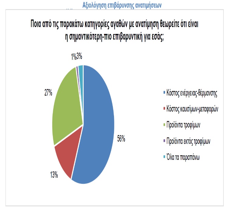 Εξειδικεύοντας τις κατηγορίες των ανατιμήσεων, φαίνεται ότι το κόστος ενέργειας και θέρμανσης είναι το πιο επιβαρυντικό για το κοινό σε ποσοστό 56% και ακολουθούν τα προϊόντα τροφίμων σε ποσοστό 27%, τα κόστη καυσίμων και μεταφορών με 13% και τέλος τα προϊόντα εκτός τροφίμων με μόλις 1%.