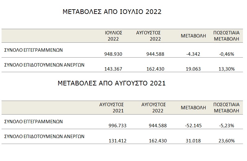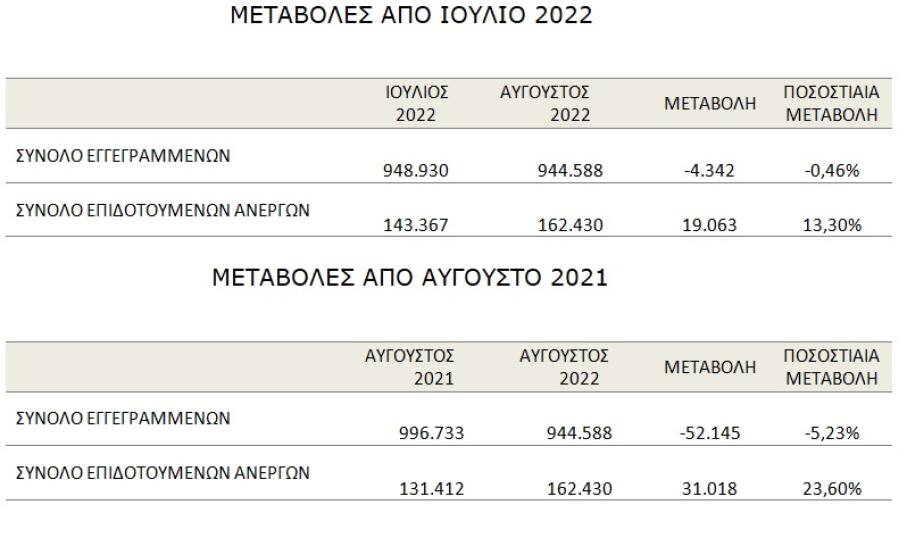 Το σύνολο των εγγεγραμμένων ανέργων, με κριτήριο την αναζήτηση εργασίας (αναζητούντων εργασία), για τον μήνα Αύγουστο 2022, ανήλθε σε 938.361 άτομα. Από αυτά 519.606 (ποσοστό 55,37%) είναι εγγεγραμμένα στο μητρώο της Δ.ΥΠ.Α για χρονικό διάστημα ίσο ή και περισσότερο των 12 μηνών και 418.755 (ποσοστό 44,63%) είναι εγγεγραμμένα στο μητρώο της Δ.ΥΠ.Α. για χρονικό διάστημα μικρότερο των 12 μηνών. Οι άνδρες ανέρχονται σε 305.938 (ποσοστό 32,60%) και οι γυναίκες ανέρχονται σε 632.423 (ποσοστό 67,40%).