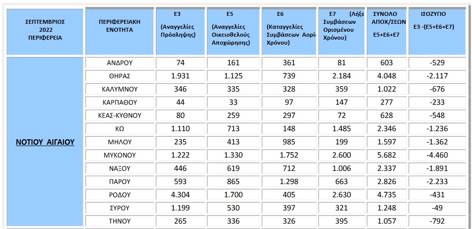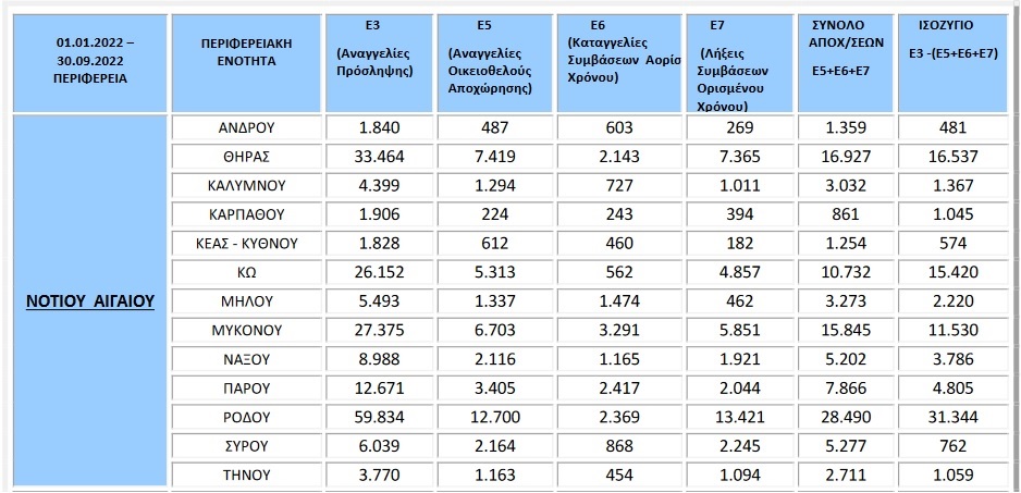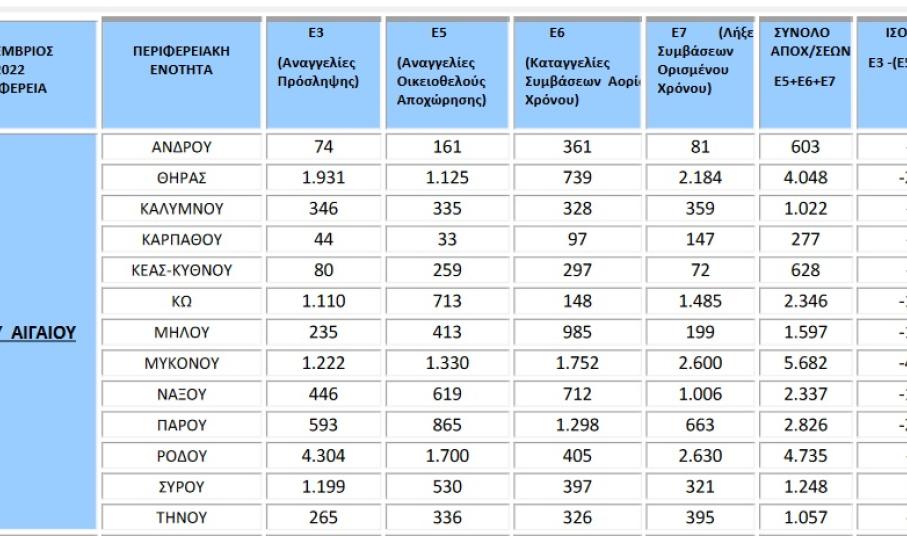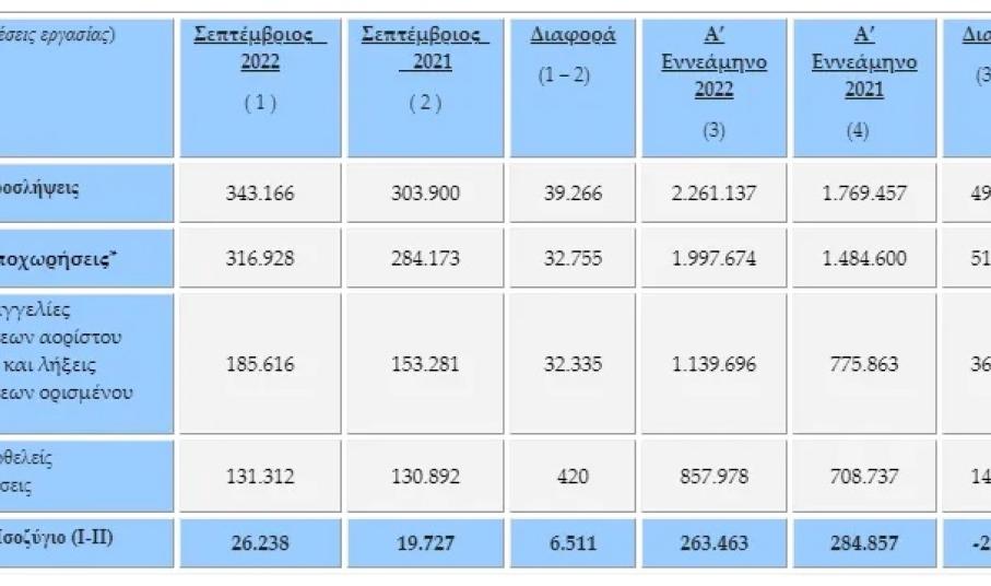 Συγκεκριμένα, σύμφωνα με τα στοιχεία των ροών μισθωτής απασχόλησης του μηνός Σεπτεμβρίου 2022, οι αναγγελίες πρόσληψης ανήλθαν σε 343.166, ενώ οι αποχωρήσεις σε 316.928. Από τις 316.928 συνολικά αποχωρήσεις, οι 131.312 προήλθαν από οικειοθελείς αποχωρήσεις και οι 185.616 από καταγγελίες συμβάσεων αορίστου χρόνου ή λήξεις συμβάσεων ορισμένου χρόνου.