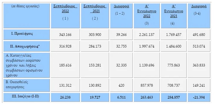 Έτσι, το ισοζύγιο των ροών μισθωτής απασχόλησης του πρώτου εννεάμηνου του έτους 2022 είναι θετικό και διαμορφώνεται στις 263.463 νέες θέσεις εργασίας.