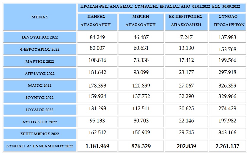 Αθροιστικά για την περίοδο Ιανουάριος – Σεπτέμβριος 2022, οι αναγγελίες προσλήψεων ανήλθαν στις 2.261.137 θέσεις εργασίας και οι αποχωρήσεις έφτασαν τις 1.997.674, εκ των οποίων οι 1.139.696 ήταν αποτέλεσμα καταγγελιών συμβάσεων αορίστου χρόνου ή λήξεων συμβάσεων ορισμένου χρόνου και οι 857.978 οικειοθελείς αποχωρήσεις.