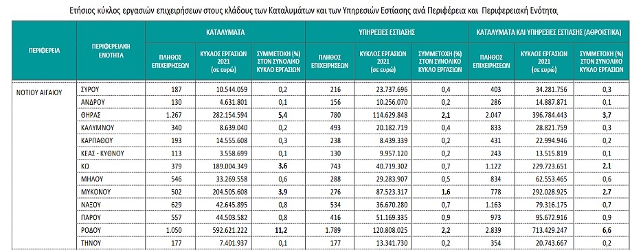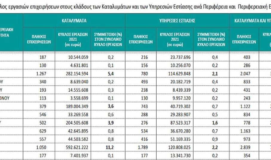 Η Ελληνική Στατιστική Αρχή (ΕΛΣΤΑΤ) παρουσιάζει τη χαρτογράφηση της εξέλιξης του κύκλου εργασιών των επιχειρήσεων που δραστηριοποιούνται στους κλάδους των καταλυμάτων και των υπηρεσιών εστίασης.