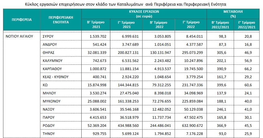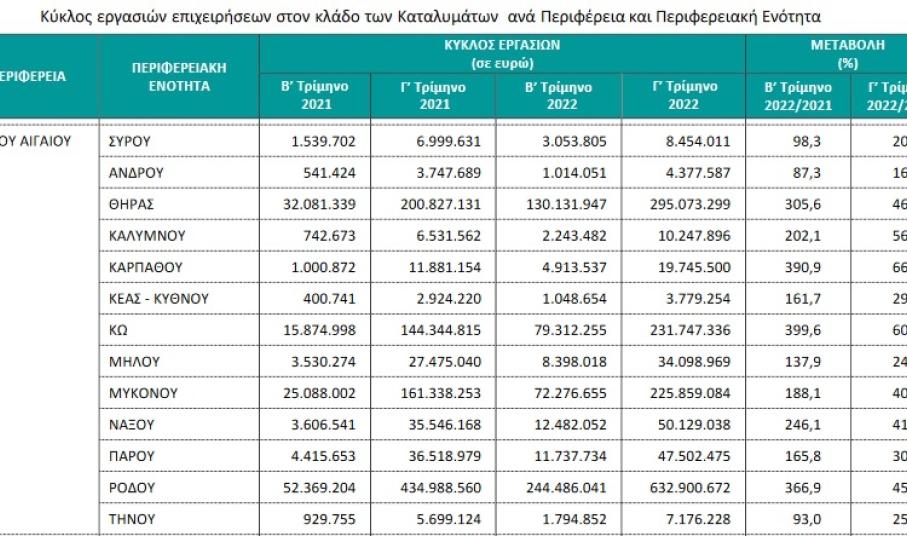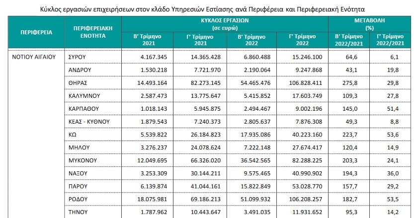 Στο σύνολο των επιχειρήσεων του κλάδου των καταλυμάτων, ο κύκλος εργασιών το τρίτο τρίμηνο 2022 ανήλθε σε 5.116.612.280 ευρώ, σημειώνοντας αύξηση 38,6% σε σχέση με το τρίτο τρίμηνο 2021, όπου είχε ανέλθει σε 3.691.771.473 ευρώ.