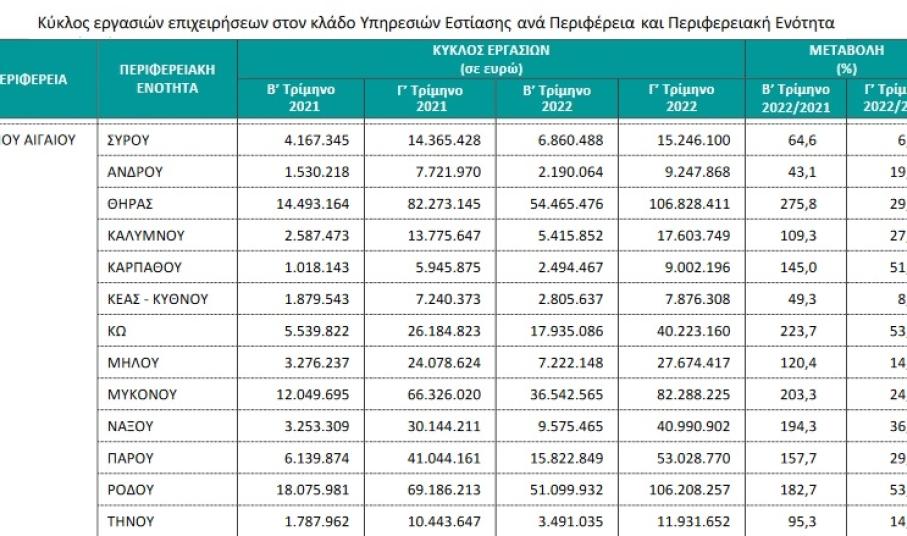 Στο σύνολο των επιχειρήσεων του κλάδου των υπηρεσιών εστίασης, ο κύκλος εργασιών το τρίτο τρίμηνο 2022 ανήλθε σε 3.086.944.873 ευρώ, σημειώνοντας αύξηση 23,8% σε σχέση με το τρίτο τρίμηνο 2021, όπου είχε ανέλθει σε 2.493.793.109 ευρώ.