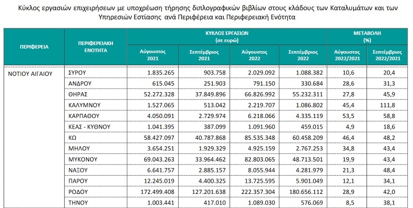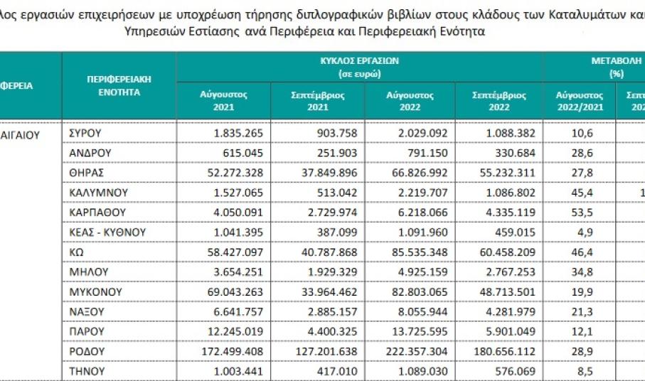 Για τις επιχειρήσεις στον κλάδο των καταλυμάτων, με υποχρέωση τήρησης διπλογραφικών βιβλίων, για τις οποίες υπάρχουν διαθέσιμα στοιχεία σε μηνιαία βάση, ο κύκλος εργασιών τον Σεπτέμβριο 2022 ανήλθε σε 1.141.961.800 ευρώ, σημειώνοντας αύξηση 36,3% σε σχέση με τον Σεπτέμβριο 2021, όπου είχε ανέλθει σε 837.649.666 ευρώ.