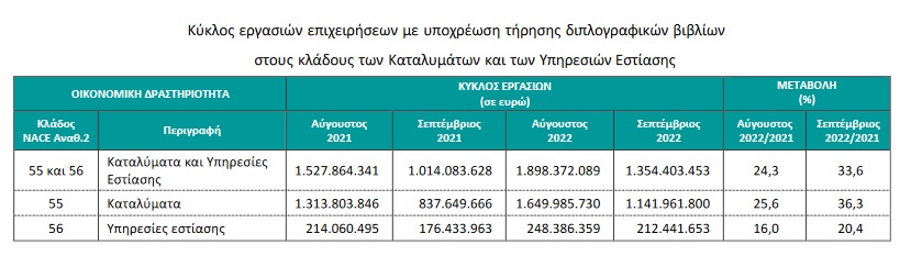 Για τις επιχειρήσεις στους κλάδους των καταλυμάτων και των υπηρεσιών εστίασης, με υποχρέωση τήρησης διπλογραφικών βιβλίων, για τις οποίες υπάρχουν διαθέσιμα στοιχεία σε μηνιαία βάση, ο κύκλος εργασιών τον Σεπτέμβριο 2022 ανήλθε σε 1.354.403.453 ευρώ, σημειώνοντας αύξηση 33,6% σε σχέση με τον Σεπτέμβριο 2021, όπου είχε ανέλθει σε 1.014.083.628 ευρώ.