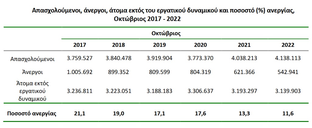 • Οι άνεργοι ανήλθαν σε 542.941 άτομα σημειώνοντας μείωση κατά 78.425 άτομα σε σχέση με τον Οκτώβριο του 2021 (-12,6%) και κατά 26.465 άτομα σε σχέση με τον Σεπτέμβριο του 2022 (-4,6%).