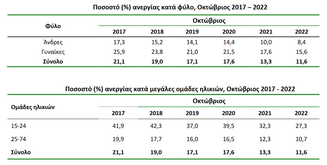 • Το εποχικά διορθωμένο ποσοστό ανεργίας τον Οκτώβριο του 2022 ανήλθε σε 11,6% έναντι του αναθεωρημένου προς τα κάτω 13,3% τον Οκτώβριο του 2021 και του αναθεωρημένου προς τα άνω 12,0% τον Σεπτέμβριο του 2022.