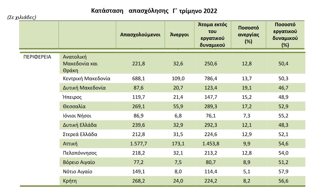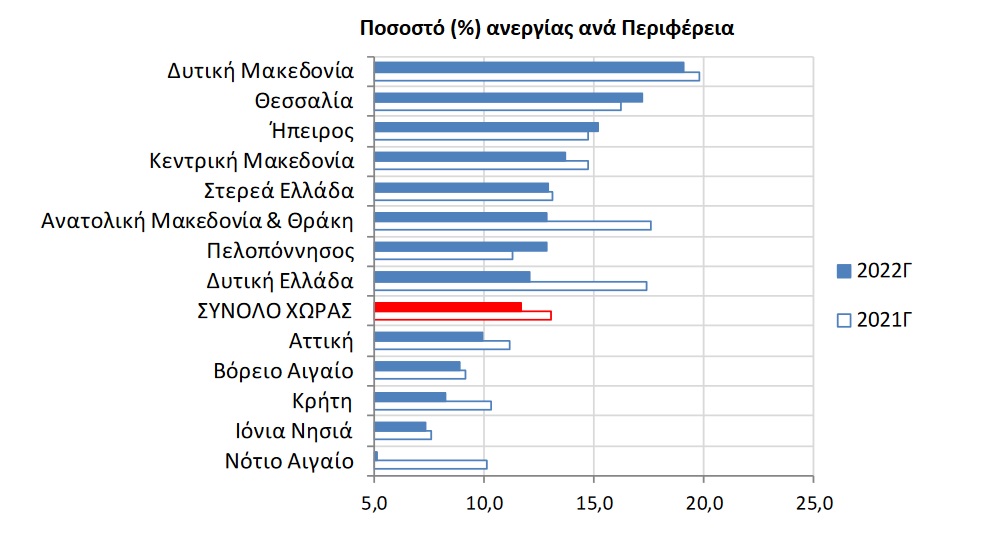 Τα υψηλότερα ποσοστά ανεργίας παρατηρούνται στις Περιφέρειες Δυτικής Μακεδονίας και Θεσσαλίας ενώ το χαμηλότερο στην Περιφέρεια Νοτίου Αιγαίου.