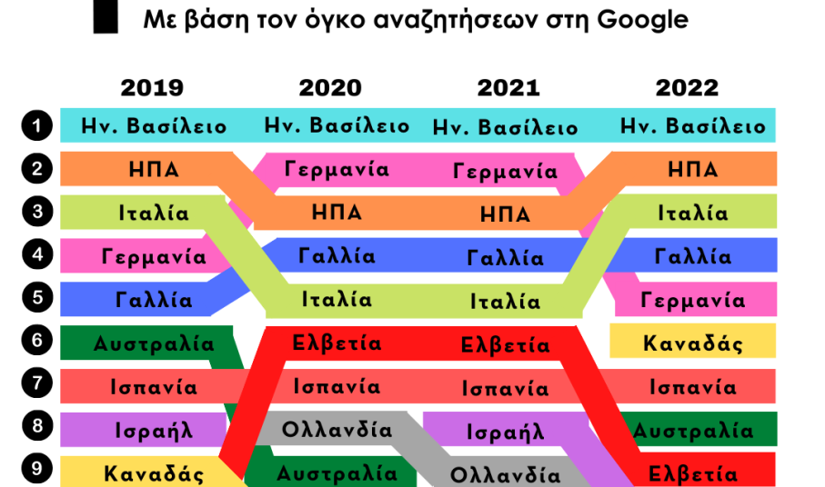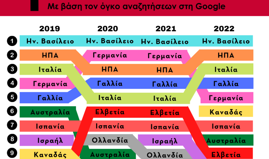 Για το 2022 παρατηρείται σημαντική αύξηση των αναζητήσεων σε σχέση με το προηγούμενο έτος για όλες τις χώρες παρακολούθησης. Σε σχέση με το 2019, όλες οι εμφανιζόμενες χώρες παρουσιάζουν επίσης αύξηση σε μικρότερο όμως βαθμό. Τη μεγαλύτερη ποσοστιαία μεταβολή για το 2022 σε σχέση με το 2019 είχαν η Ιρλανδία, η Γαλλία και οι ΗΠΑ. Είναι σημαντικό να αναφέρουμε πως σε σχέση με το 2021 έντονη αύξηση των αναζητήσεων είχαν οι ΗΠΑ, το Ηνωμένο Βασίλειο και η Ιταλία.