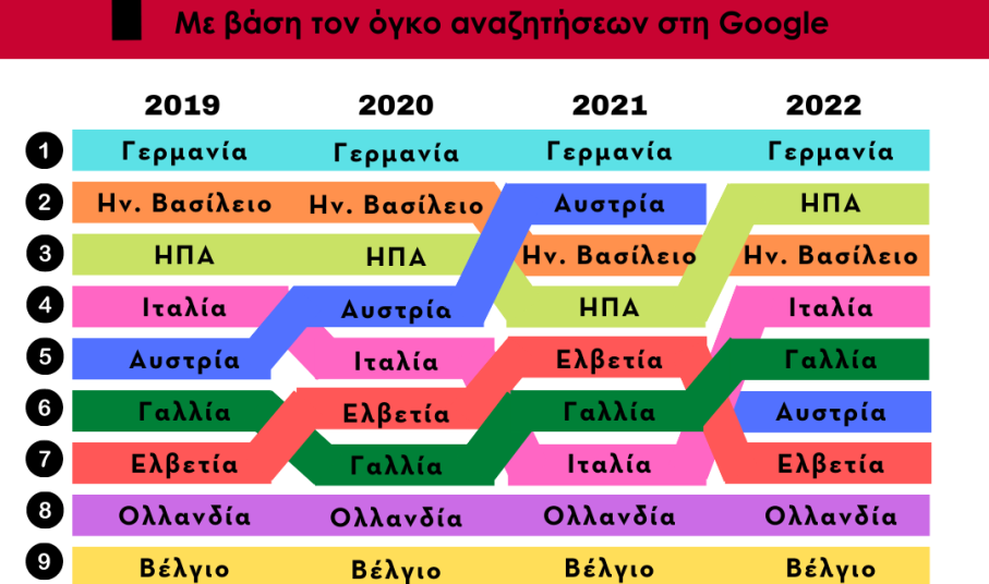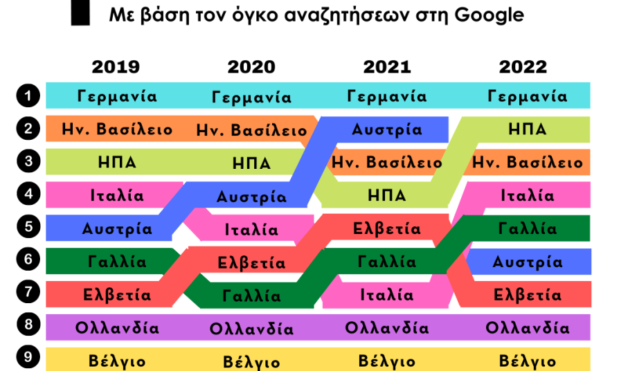 Για το 2022 παρατηρείται σημαντική αύξηση των αναζητήσεων σε σχέση με το προηγούμενο έτος για όλες τις χώρες παρακολούθησης. Σε σχέση με το 2019, όλες οι χώρες παρουσιάζουν επίσης αύξηση σε μικρότερο όμως βαθμό. Τη μεγαλύτερη ποσοστιαία μεταβολή για το 2022 σε σχέση με το 2019 είχαν οι ΗΠΑ, η Γερμανία και η Γαλλία. Είναι σημαντικό να αναφέρουμε πως σε σχέση με το 2021 έντονη αύξηση των αναζητήσεων είχαν οι ΗΠΑ, το Ηνωμένο Βασίλειο, η Γαλλία και η Ιταλία..