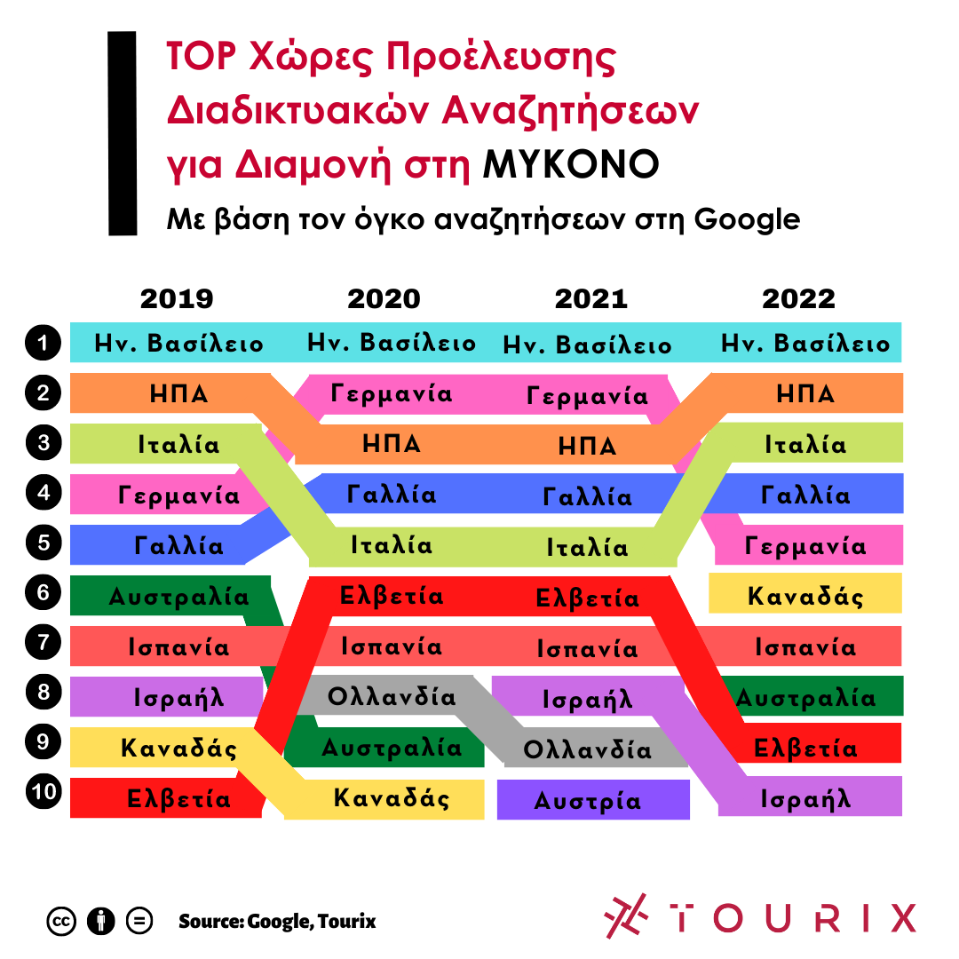 Οι κορυφαίες χώρες σε επίπεδο αναζητήσεων για διαμονή στη Μύκονο για το 2022 ήταν οι ΗΠΑ και το Ηνωμένο Βασίλειο, ενώ ακολουθούν η Ιταλία, η Γαλλία και η Γερμανία. Σημαντικές είναι και οι αγορές-χώρες που συμπληρώνουν τη δωδεκάδα που είναι ο Καναδάς, η Ισπανία, η Αυστραλία, η Ελβετία, το Ισραήλ, η Ολλανδία και η Αυστρία. Η μεγάλη διαφορά με την κατάταξη των τοπ χωρών σε σχέση με το 2021 είναι πως οι τοπ 5 χώρες ήταν το Ηνωμένο Βασίλειο, η Γερμανία, οι ΗΠΑ, η Γαλλία και η Ιταλία.