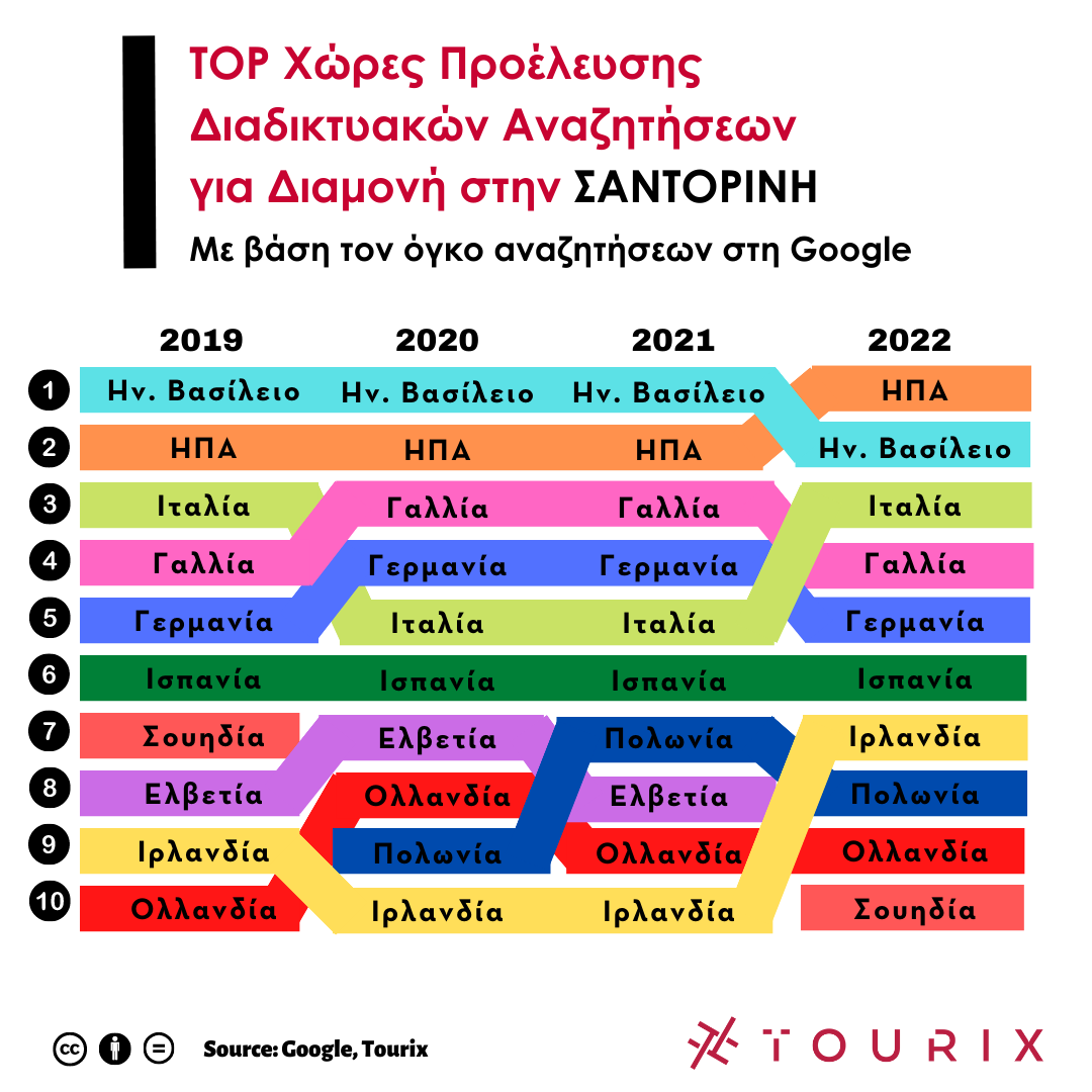Οι κορυφαίες χώρες σε επίπεδο αναζητήσεων για διαμονή στη Σαντορίνη για το 2022 ήταν οι ΗΠΑ και το Ηνωμένο Βασίλειο, ενώ ακολουθούν με σημαντική διαφορά η Ιταλία, η Γαλλία και η Γερμανία. Σημαντικές είναι και οι αγορές-χώρες που συμπληρώνουν τη δεκάδα που είναι η Ισπανία, η Ιρλανδία, η Πολωνία, η Ολλανδία και η Σουηδία. Η μεγάλη διαφορά με την κατάταξη των τοπ χωρών σε σχέση με το 2021 είναι πως η τοπ χώρα ήταν το Ηνωμένο βασίλειο και ακολουθούσαν οι ΗΠΑ, η Γαλλία, η Γερμανία και η Ιταλία.