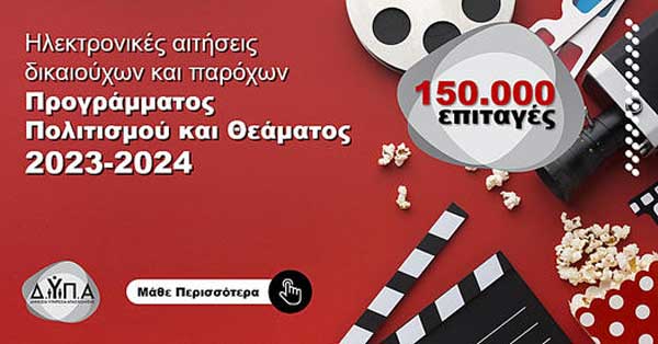 Παρατάθηκε μέχρι τις 23:59 σήμερα, Δευτέρα 11 Δεκεμβρίου 2023, η υποβολή ηλεκτρονικών αιτήσεων δικαιούχων για το Πρόγραμμα Πολιτισμού και Θεάματος της Δημόσιας Υπηρεσίας Απασχόλησης (ΔΥΠΑ) για την περίοδο 2023-2024.