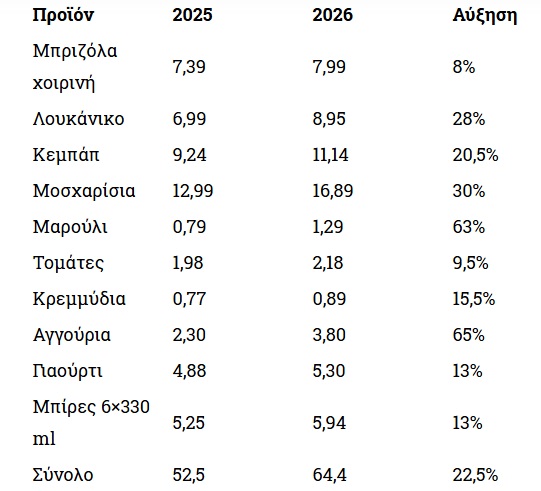 Οι τιμές σε πολλά είδη κρεάτων είναι από 1 έως και 4 ευρώ ακριβότερα. Σύμφωνα με τον πρόεδρο της Ένωσης Εργαζομένων Καταναλωτών Ελλάδας και μέλος της Διοίκησης της ΓΣΕΕ, Απόστολο Ραφτόπουλο, οι χοιρινές μπριζόλες πωλούνται στα 8 ευρώ αυξημένες κατά 8% σε σχέση με την αντίστοιχη περσινή περίοδο, ενώ οι τιμές στα λουκάνικα έχουν αυξηθεί κατά 28%, στο κεμπάπ κατά 20,5%, στην μοσχαρίσια μπριζόλα κατά 30%, στο μαρούλι κατά 63%, στις τομάτες κατά 9,5%, και στα αγγούρια κατά 65%.