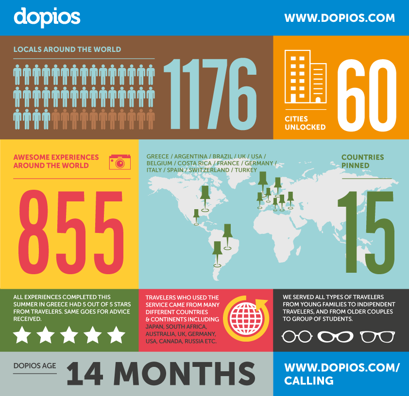 Την ευκαιρία για μία βαθύτερη γνωριμία με την ιστορία και τη ζωή ενός τόπου πέρα από τις τυπικές προτάσεις ενός τουριστικού οδηγού προσφέρει στους ταξιδιώτες η ιστοσελίδα dopios.com. Πρόκειται για μία ταξιδιωτική κοινότητα, γεμάτη από παθιασμένους ντόπιους που θέλουν να δείξουν τα μέρη τους όπως ακριβώς εκείνοι τα ζουν και τα γνωρίζουν. Μυστικές γωνιές, δραστηριότητες που απολαμβάνουν, μέρη που αγαπούν, μαγαζιά που προτιμούν, διαδρομές μοναδικές, όλα όσα ένας ταξιδιώτης δυσκολεύεται να ανακαλύψει μόνος του.